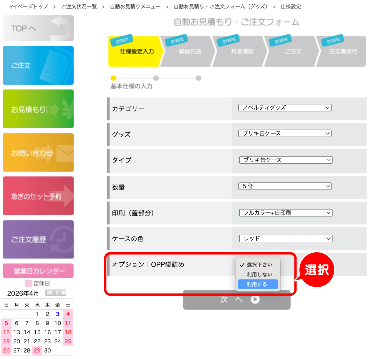 | マイページでのご注文時に「オプション:OPP袋詰め」の項目で「利用する」を選択して下さい。 |