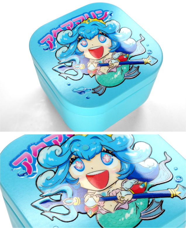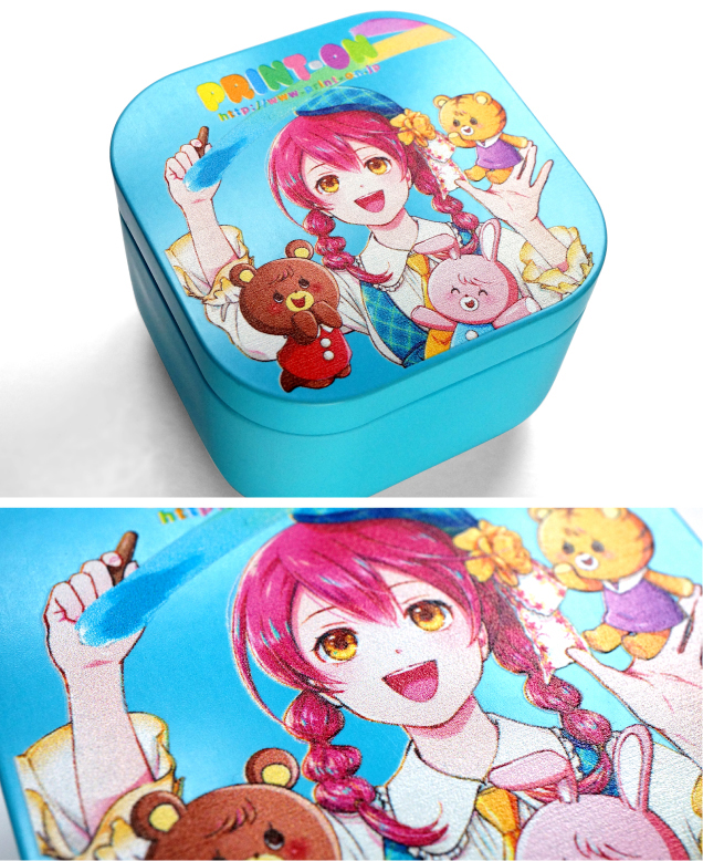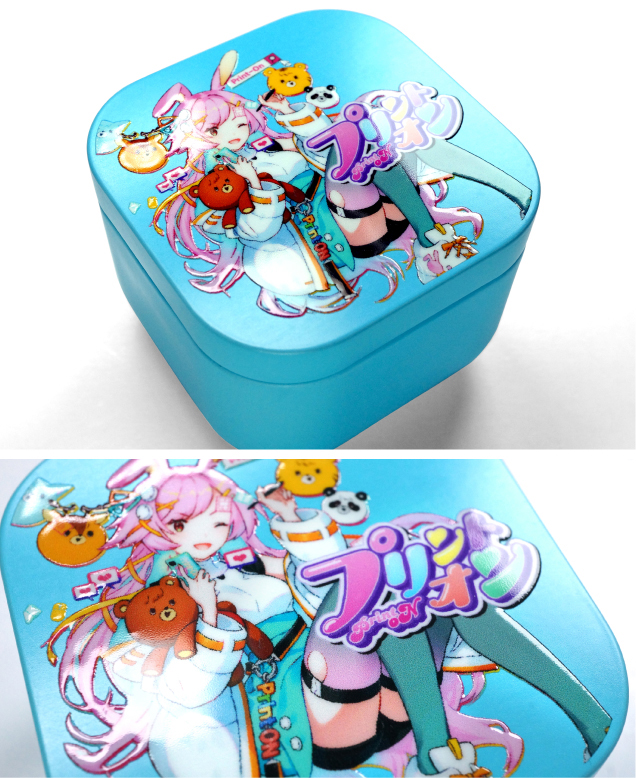 ブリキ缶ケース/ライトブルー/フルカラー(CMYK)+白印刷 |