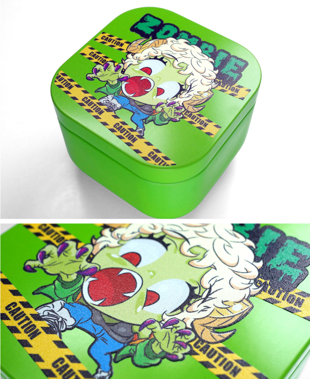 ブリキ缶ケース/グリーン/フルカラー(CMYK)+白印刷 |