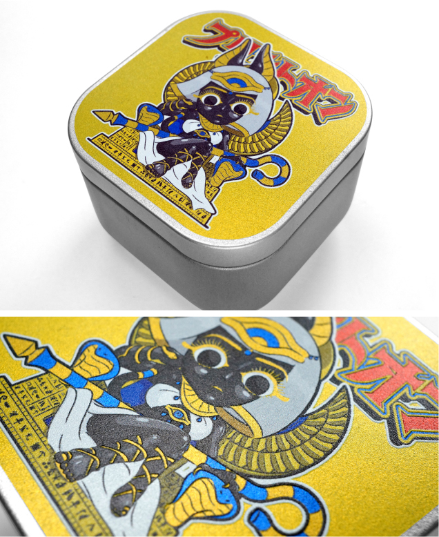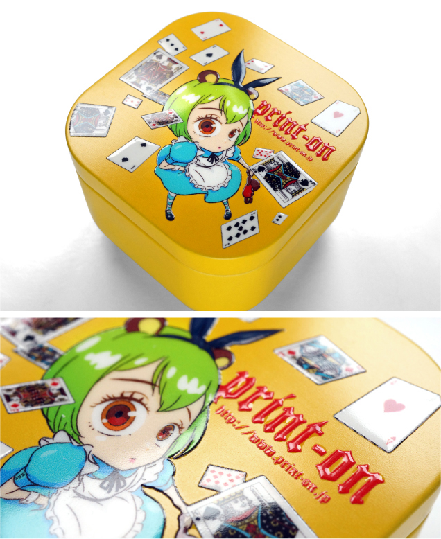 ブリキ缶ケース/イエロー/フルカラー(CMYK)+白印刷 |