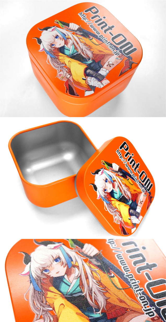 ブリキ缶ケース/オレンジ/フルカラー(CMYK)+白印刷 |