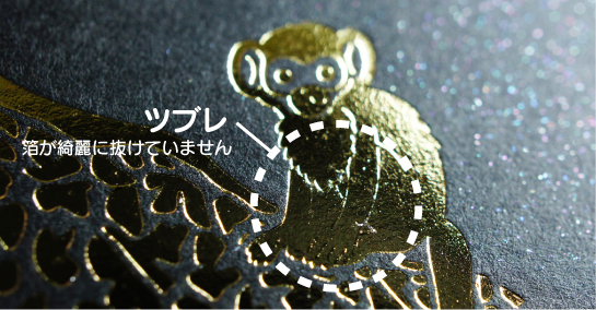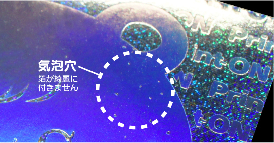 転写した時に用紙と箔の間に空気が入ってしまい、面積が広い為、空気の逃げ場所が無く、空気ごと箔押しするようになり、空気があった部分は箔が付かない気泡穴が出来易くなります。なるべくベタは避けた絵柄をお勧めします。予めご了承下さい。 |