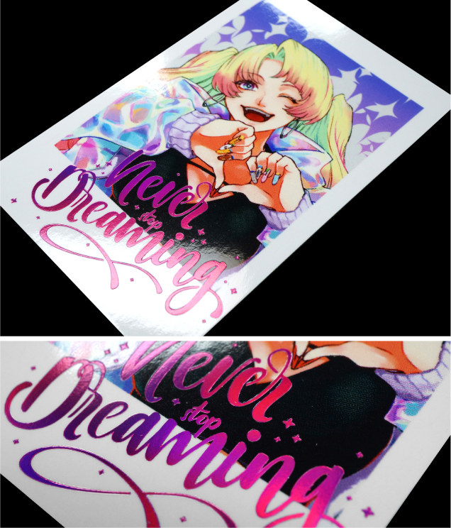 | コートカード紙220kg/フルカラーRGB印刷/クリアPP 専用オプション:箔押し加工/レインボーピンク |