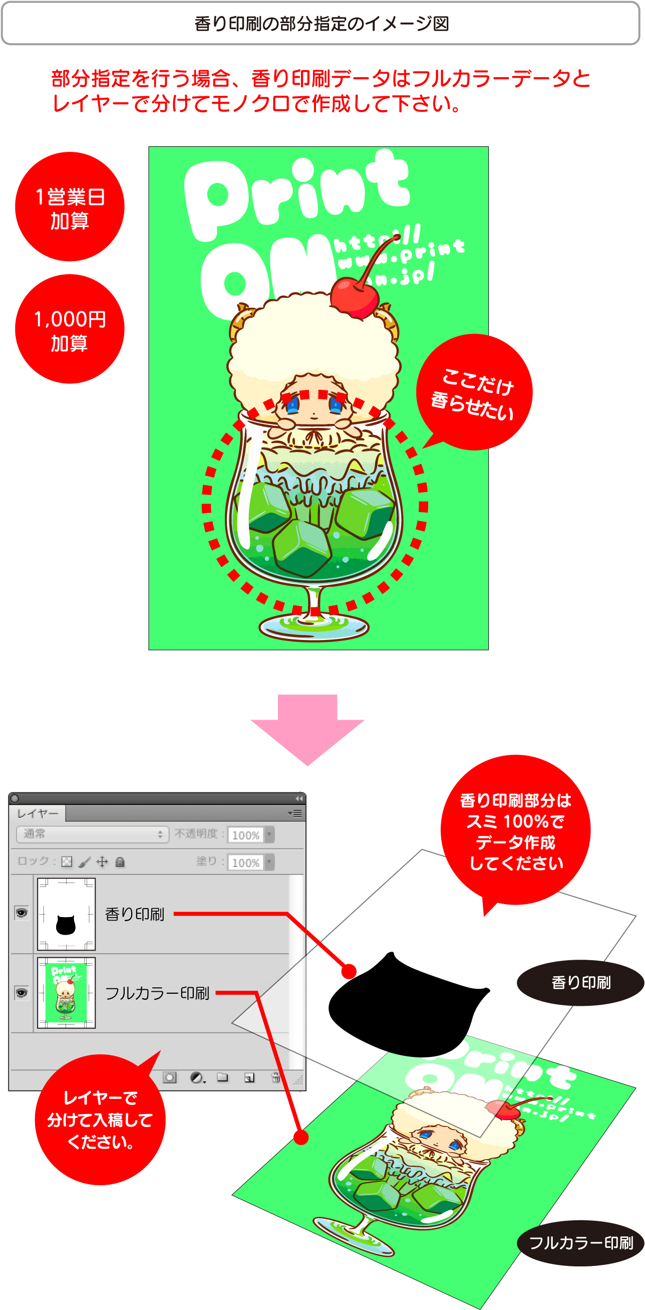 | 香り印刷の部分指定 | +1営業日 | 1,000円加算 (固定) |