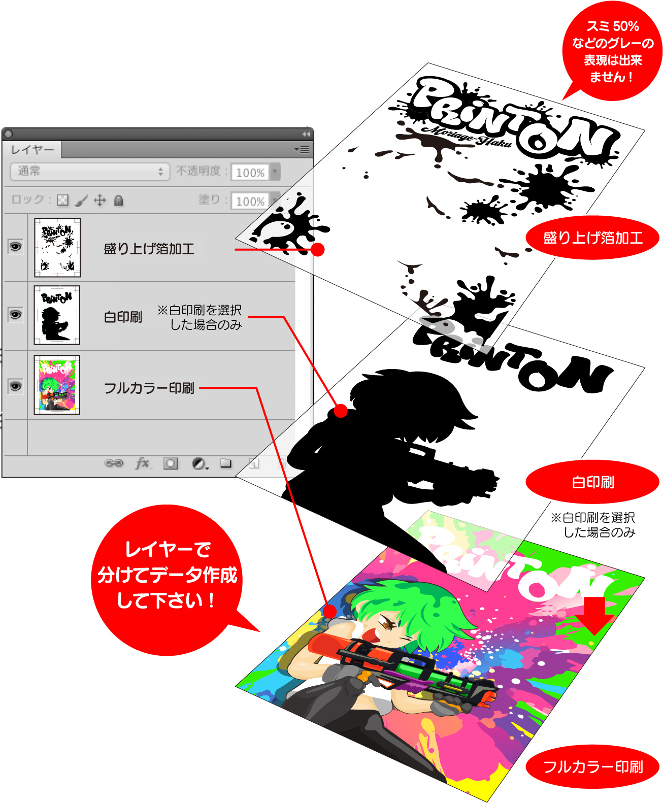 | フルカラー印刷データと盛り上げ箔加工データはレイヤーで分けて、データ作成下さい。。 また、白印刷をご利用される場合も白印刷部分は別レイヤーで作成下さい。 盛り上げ箔加工する部分をスミ100%で作成して下さい。 スミ50%などのグレーの表現は出来ません。 |