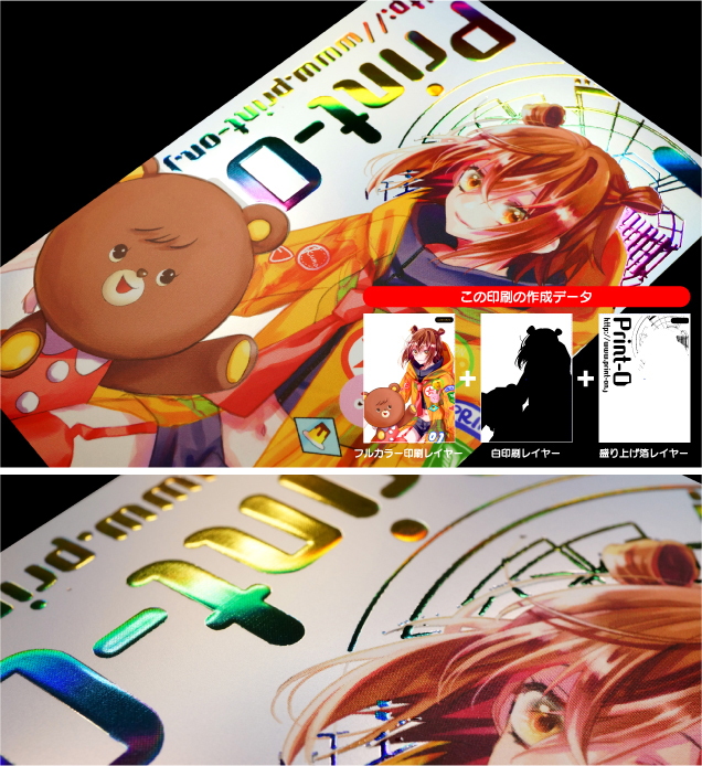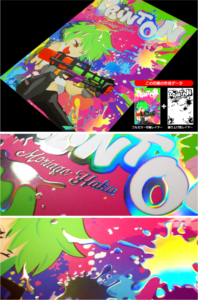 | ホログラムペーパー195kgレインボー/フルカラーRGB+白印刷/マットPP 盛り上げ箔加工:虹 |