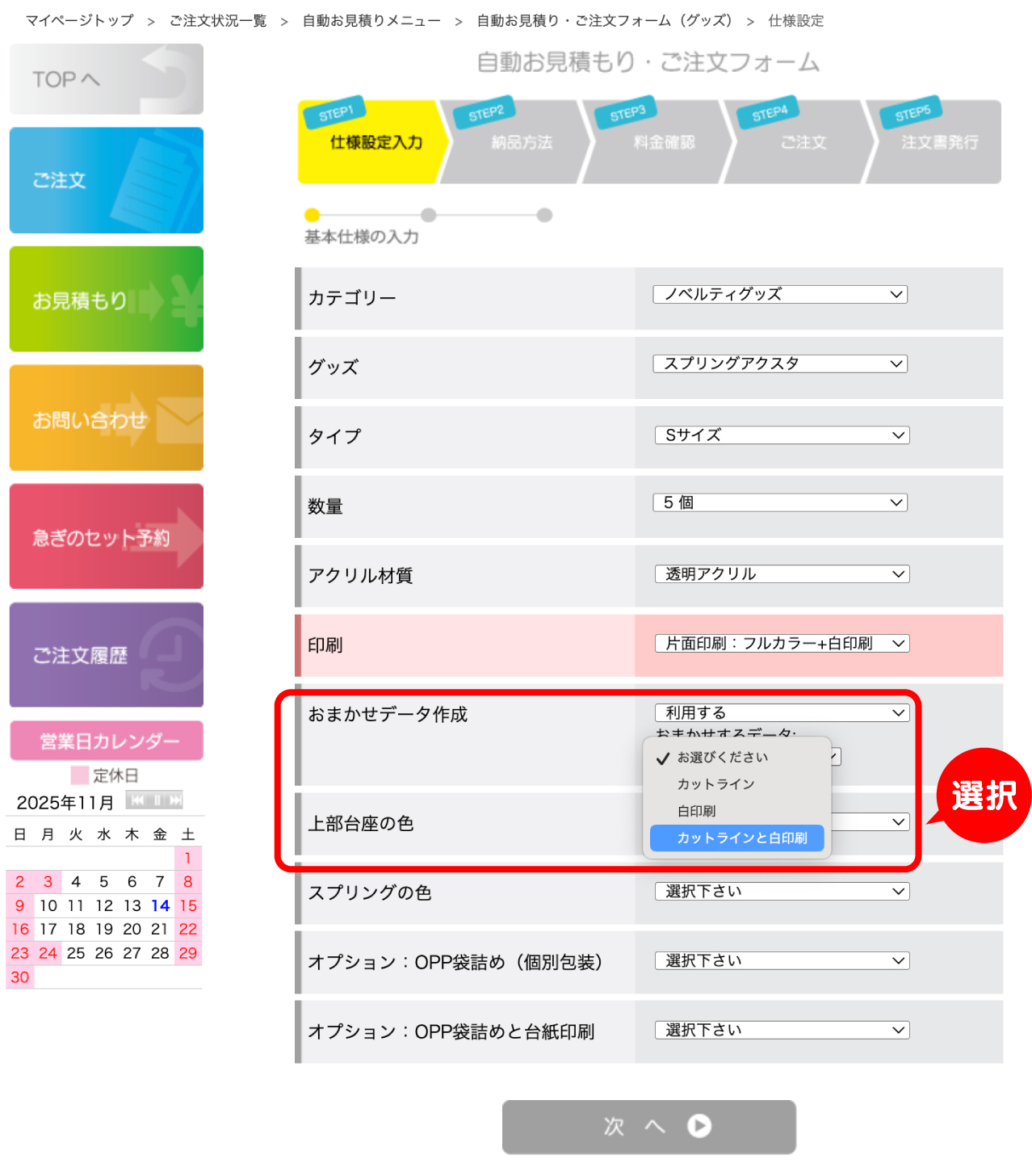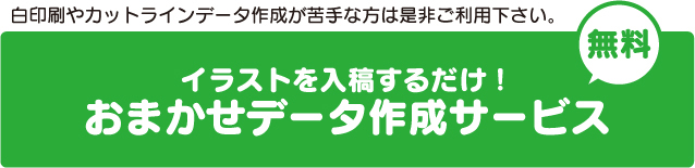 | カットラインのおまかせは、絵柄の2ミリ外側をカットするようにデータ作成します。 白印刷のおまかせは、キャラクター等絵柄の下地に白印刷を施します。 |