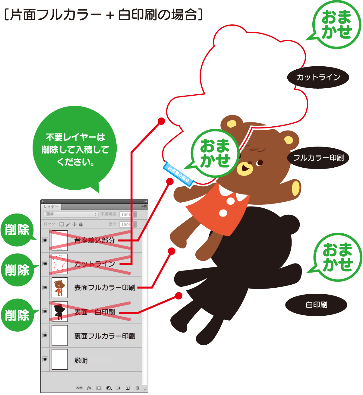 台座差込部分レイヤーやカットラインレイヤー、白印刷レイヤーは削除してご入稿下さい。 |