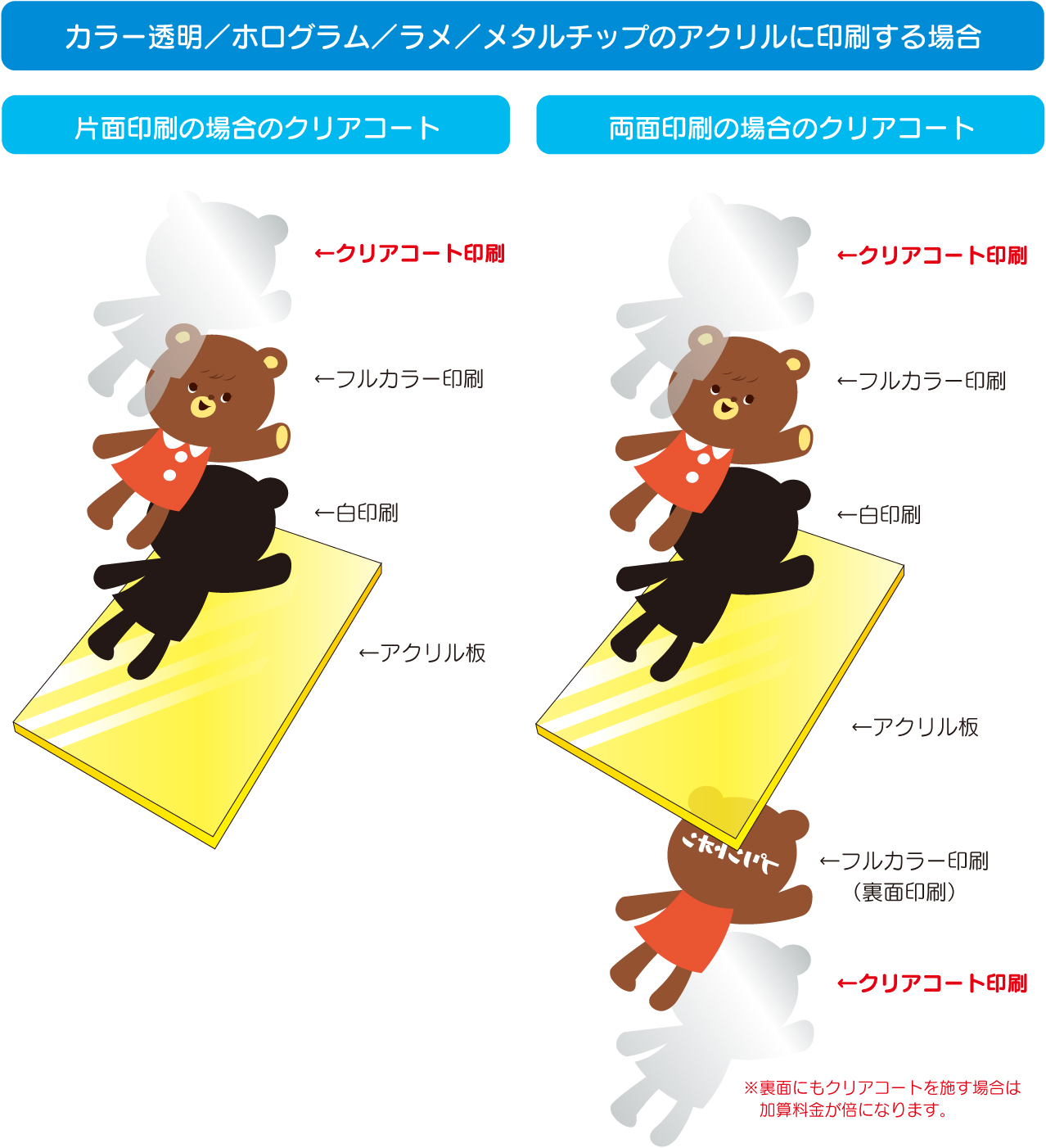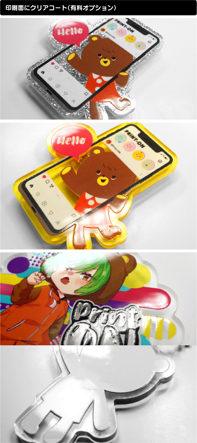 | 印刷面にクリアコート処理でぷっくり可愛く、キズも防げます。 ご注文時にクリアコートを選択するだけで簡単にご利用可能です。 印刷部分に光沢と厚みのあるクリアインクでコーティングします。透明アクリルを選択され、片面印刷の場合は白版の上にクリアコートするようになります。透明アクリルを選択され、両面印刷の場合は裏面の絵柄の上にクリアコートするようになります。また、カラー透明アクリルやホログラムアクリル、ラメアクリル、メタルチップアクリルの片面印刷の場合はオモテ面絵柄の上からクリアコート致します。さらに裏面印刷がある場合は、裏面にもクリアコートを選択可能です。 ※クリアコート用にデータを用意する必要はありません。 ※クリアコート部分には気泡穴が入る場合があります。 特に広いベタで発生しやすくなり、品質上避けられません。予めご了承下さい。 ※1営業日の加算納期が発生します。(両面にクリアコートを施す場合は2営業日加算) ※加算料金が発生します。 |