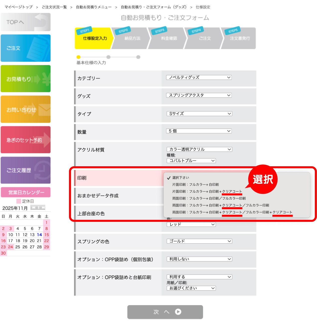 | マイページでのご注文時に「アクリル材質」を選択すると、「印刷」を選択する項目が 表示されますので印刷方式を選択すると同時にクリアコートも選択下さい。 |