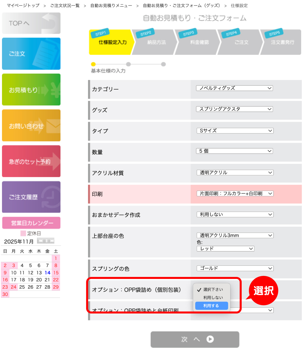 | マイページでのご注文時に「オプション:OPP袋詰め」の項目で「利用する」を選択して下さい。 |