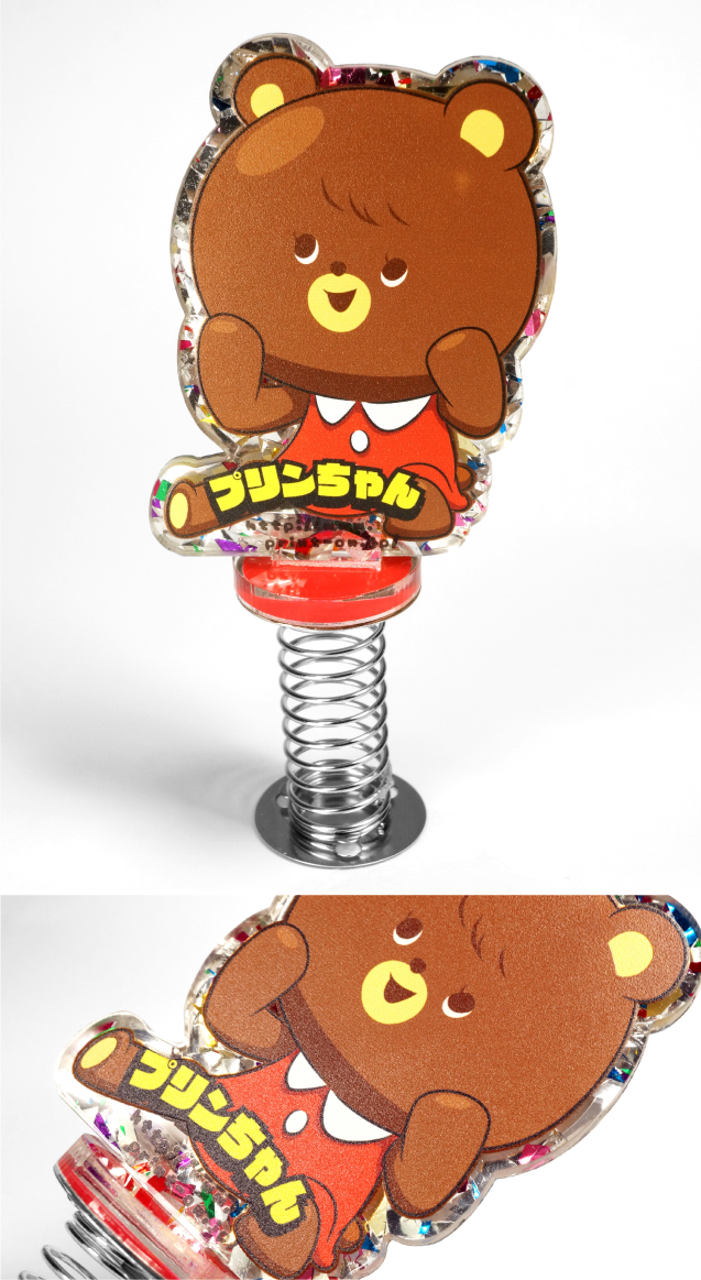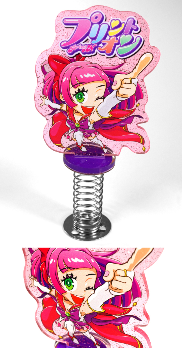 | Mサイズ/ラメアクリル ピンク/フルカラー+白印刷 上部台座の色:パープル/スプリングの色:シルバー |