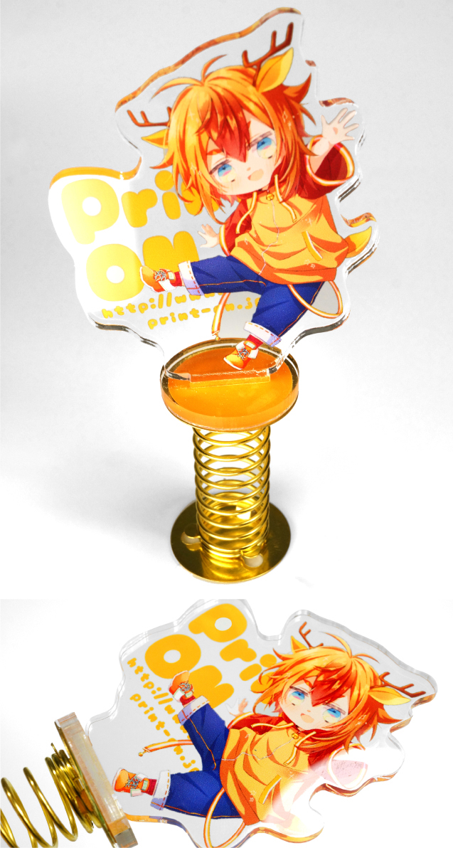 | Mサイズ/透明アクリル/フルカラー+白印刷 上部台座の色:オレンジ/スプリングの色:ゴールド |