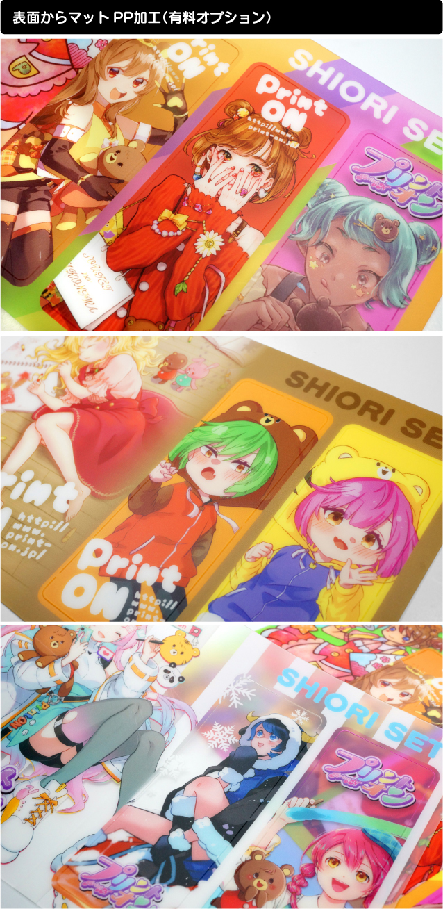 | TOP>>グッズ>>透明しおりセット>>オプション:表面からマットPP加工 |