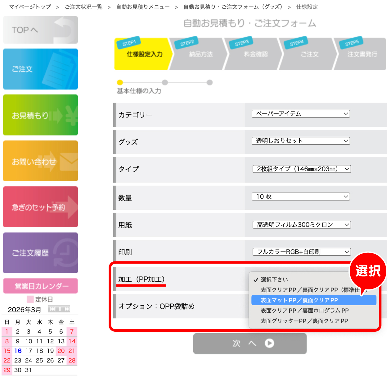 | マイページでのご注文時に「加工(PP加工)」の項目で「表面マットPP/裏面クリアPP」を選択して下さい。 |