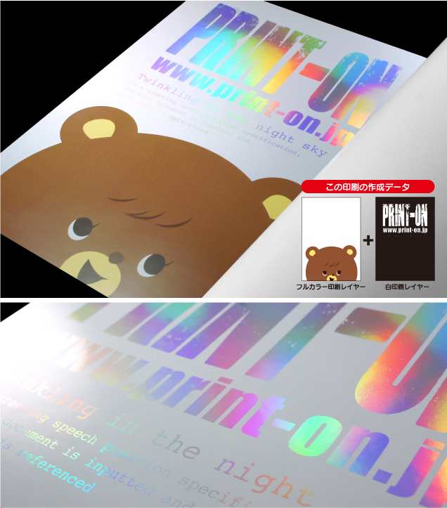 | ホログラムペーパーレインボー(フルカラー+白印刷) 白印刷でタイトル部分以外はホログラム紙が見えないようにして、タイトルに箔押ししたようにみせています。 |