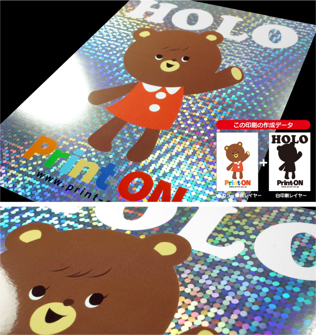 | ホログラム紙に印刷する場合、白印刷を施さなければ下地の色が透けて見えるので絵柄が目立たなくなり、色味も下地の色を強く反映して変わってしまいます。キャラクターなど色味が変わって困るような絵柄部分の下地には白印刷(白100%)を引いて下さい。 |