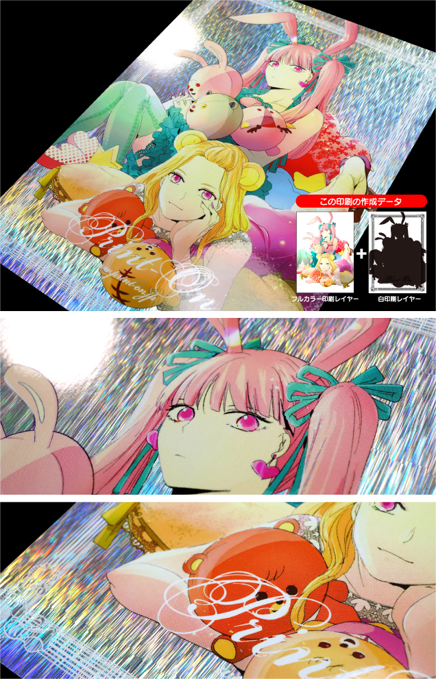 | ホログラム紙に印刷する場合、白印刷を施さなければ下地の色が透けて見えるので絵柄が目立たなくなり、色味も下地の色を強く反映して変わってしまいます。キャラクターなど色味が変わって困るような絵柄部分の下地には白印刷(白100%)を引いて下さい。 |