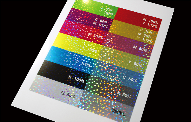 | ホログラム紙に印刷する場合、白印刷を施さなければ下地の色が透けて見えるので絵柄が目立たなくなり、色味も下地の色を強く反映して変わってしまいます。キャラクターなど色味が変わって困るような絵柄部分の下地には白印刷(白100%)を引いて下さい。 |