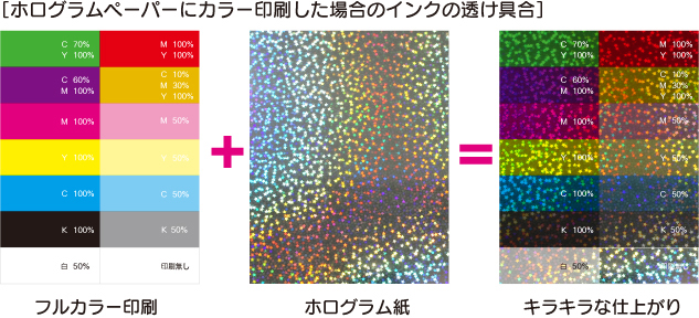 | ホログラムペーパーにカラー印刷した場合の透け具合 |