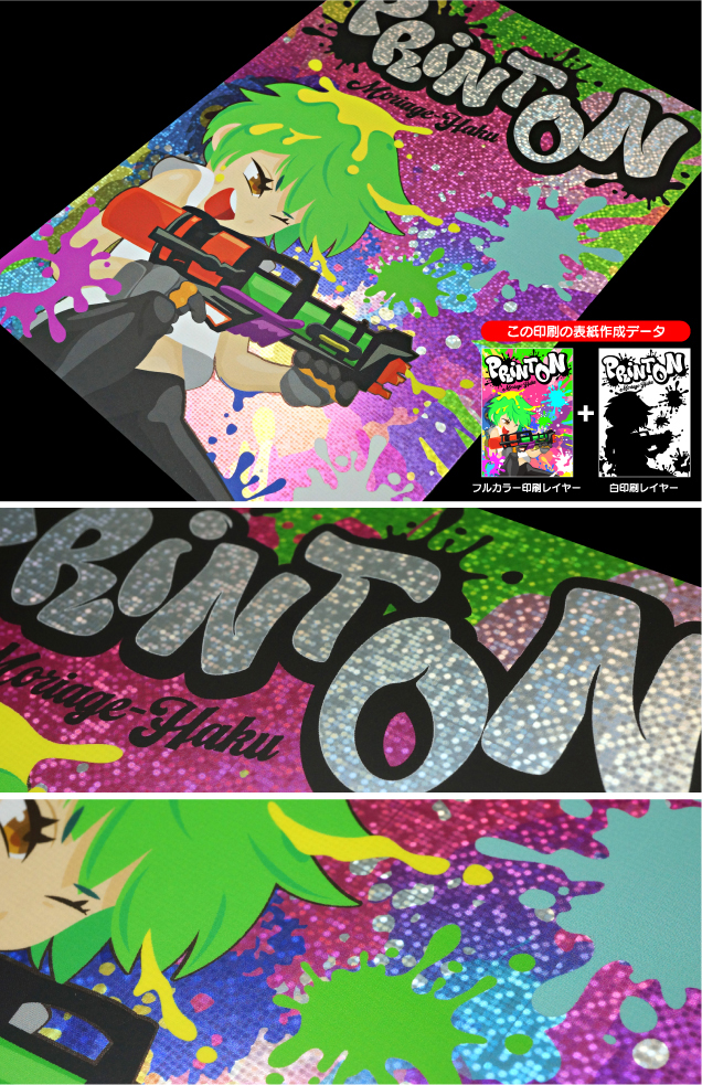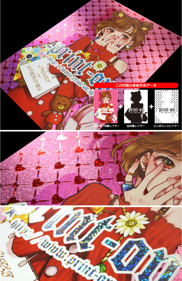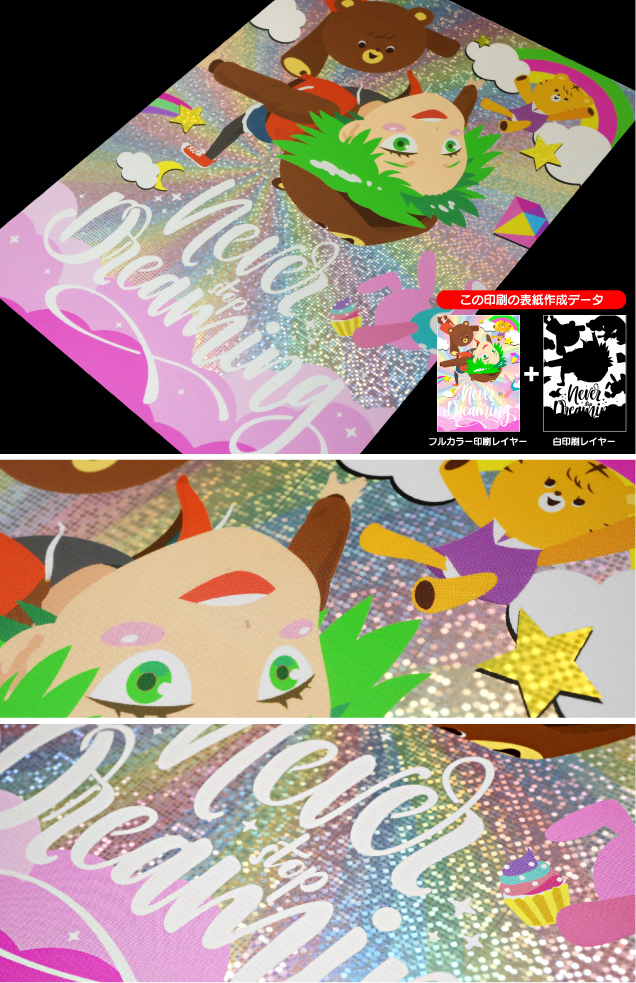 | ホログラムペーパードットネオンはドットネオン柄で虹色にギラギラ輝く用紙ですが、マットPPを施すことにより、ギラギラした虹色の輝きが抑えられ、上品で淡く虹色に輝くドットネオン柄の用紙に早変わりします。 ベースがシルバーなので下地に白印刷を施さなければ用紙の色の銀色を反映して暗く仕上がってしまいますので、キャラクターなど色味が変わって困るような絵柄は下地に白印刷を施して下さい。下地に白印刷を施すことにより、用紙の質感を隠したりして、必要な部分のみ用紙の質感を得る事も可能です。白印刷のみでタイトル等を印刷するのもオシャレに仕上がります。 さらにエンボスニス加工を施すと、加工部分のみホログラムペーパーのギラギラ感と虹色の輝きが復活するので、アイデア次第でとても面白い効果が得られます。(エンボスニスセットからお得にご利用可能です) 裏面はコート系の白い紙です。 ※白印刷ベタで印刷しても完全な白にはなりません。若干のホログラム柄が見えてしまいます。 ※ホログラムペーパーはキズ付き易い用紙です。多少の擦りキズなどが入ることが有ります。予めご了承の上、ご利用下さい。 ※ホログラムペーパーは用紙製造時の仕様により、縦縞模様の微細な凹凸があります。PP加工を施すことによりその縞模様が若干目立ってしまいます。予めご了承下さい。 ※この用紙は表紙2-3印刷をご利用頂けません。 |