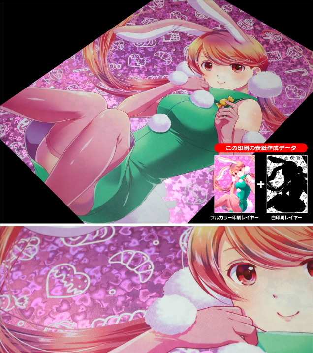 | ホログラム紙に印刷する場合、白印刷を施さなければ下地の色が透けて見えるので絵柄が目立たなくなり、色味も下地の色を強く反映して変わってしまいます。キャラクターなど色味が変わって困るような絵柄部分の下地には白印刷(白100%)を引いて下さい。 |