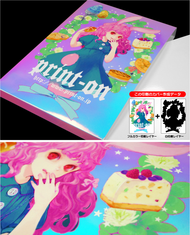 | ベースはスカイブルーの用紙ですが、光の当たり方でコバルトブルーやパープルに変色します。色の変化が顕著で濃い色味なので、とても綺麗でインパクトが抜群です。用紙自体にブルーの色が入っていますので、下地に白印刷を施さないとキャラクターの肌の薄い部分などは下地のブルーが出ますので青い顔となってしまいます。色味が変わって欲しくない部分には必ず下地に白印刷を施して下さい。もちろん白い印刷のみで絵柄を表現することも可能です。シンプルなデザインにしたり、表紙の質感を生かしたデザインをお勧め致します。 裏面はコート系の白い紙です。 また、ジュエルペーパーにマットPPやグリッターPPを施すと輝きが変わるのでお勧めです。 【マットPPの場合のページへ】 【グリッターPPの場合のページへ】 ※ジュエルぺーパーはキズ付き易い用紙です。多少の擦りキズなどが入ることが有ります。予めご了承の上、ご利用下さい。 ※セット商品以外でジュエルペーパーへ白印刷を施したい場合は、オーダーメイドにてお問い合わせ下さい。 ※この用紙は表紙2-3印刷をご利用頂けません。 |