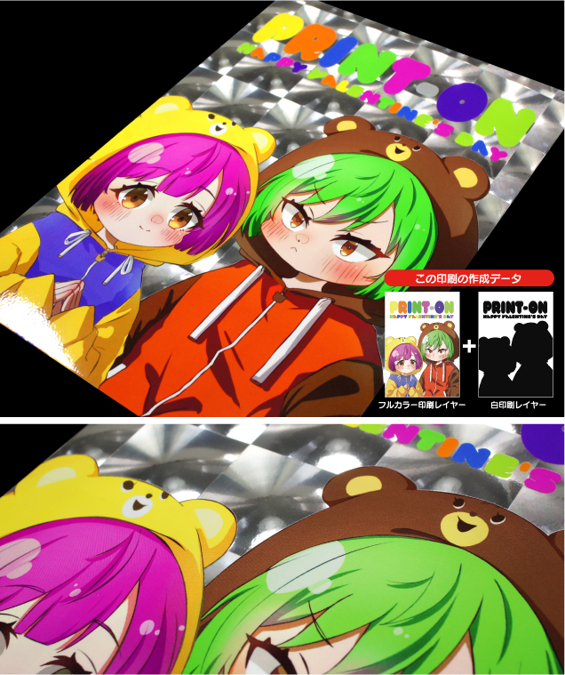| レンズペーパーに印刷する場合、キャラクターなどの下地に白印刷を施さなければ、紙のレンズ柄が透けて見えるので「レンズ柄のキャラクター」になってしまいます。キャラクターなどレンズ柄が見えて困るような絵柄部分や飛び出して見せたい絵柄の下地には白印刷(白100%)を引いて下さい。 |