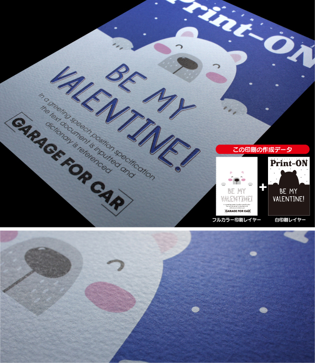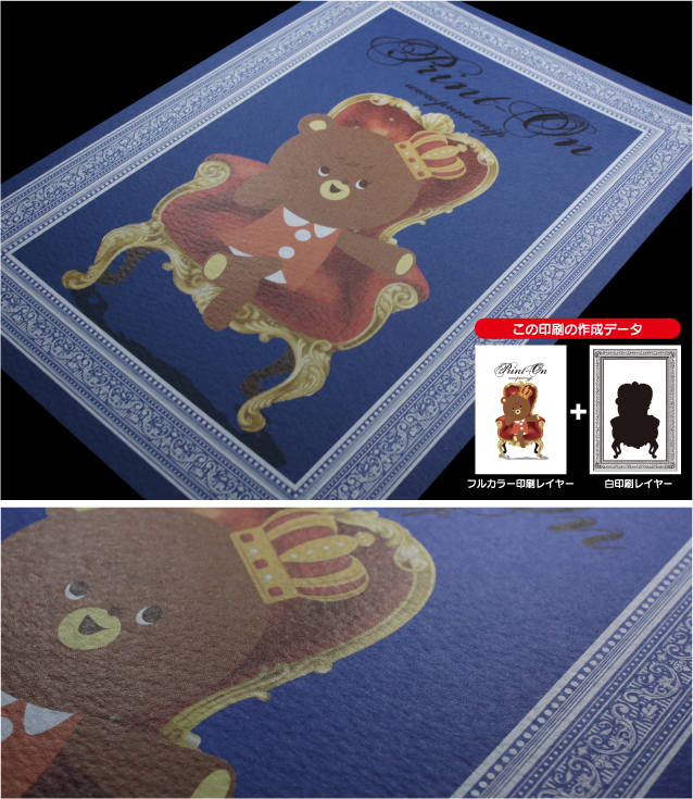 ※白印刷ベタで印刷しても完全な白にはなりません。若干下地の色を反映した白となります。 ※フルカラー印刷を行う場合は、下地に白印刷ベタを印刷しないと大幅に色が変わります。 |