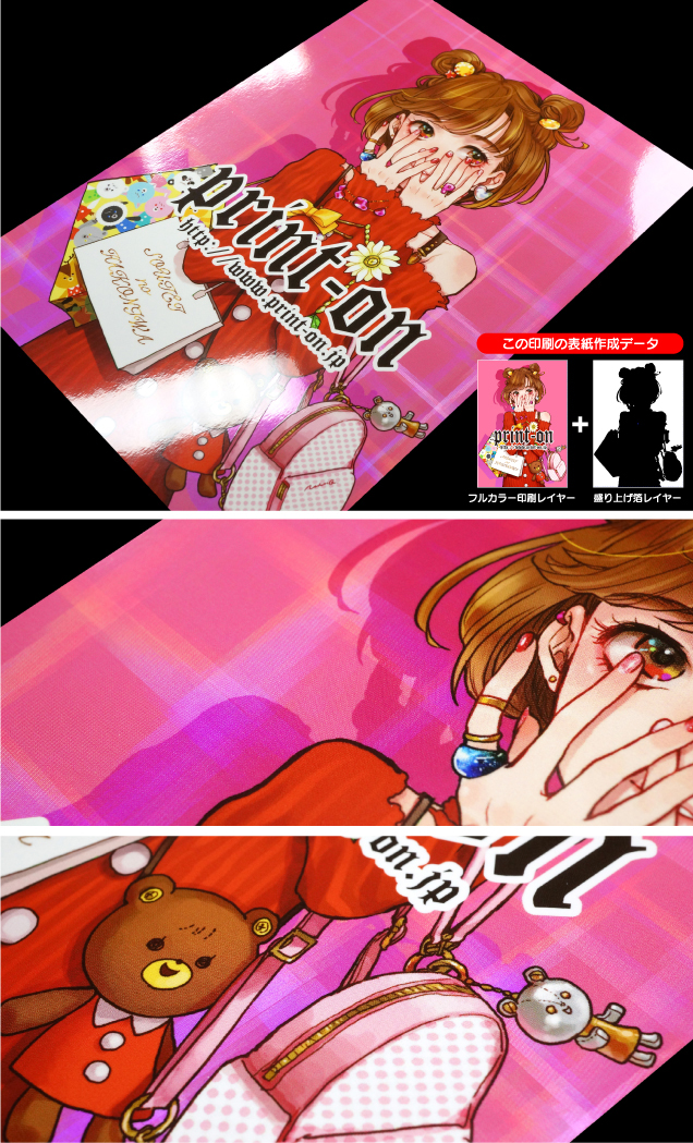 | ホワイトホロペーパー180kgチェック/フルカラーRGB+白印刷/クリアPP キャラクターとタイトルに白押さえして、背景をキラキラにしています。 「ホワイトホログラムセット」でご利用可能です。 |