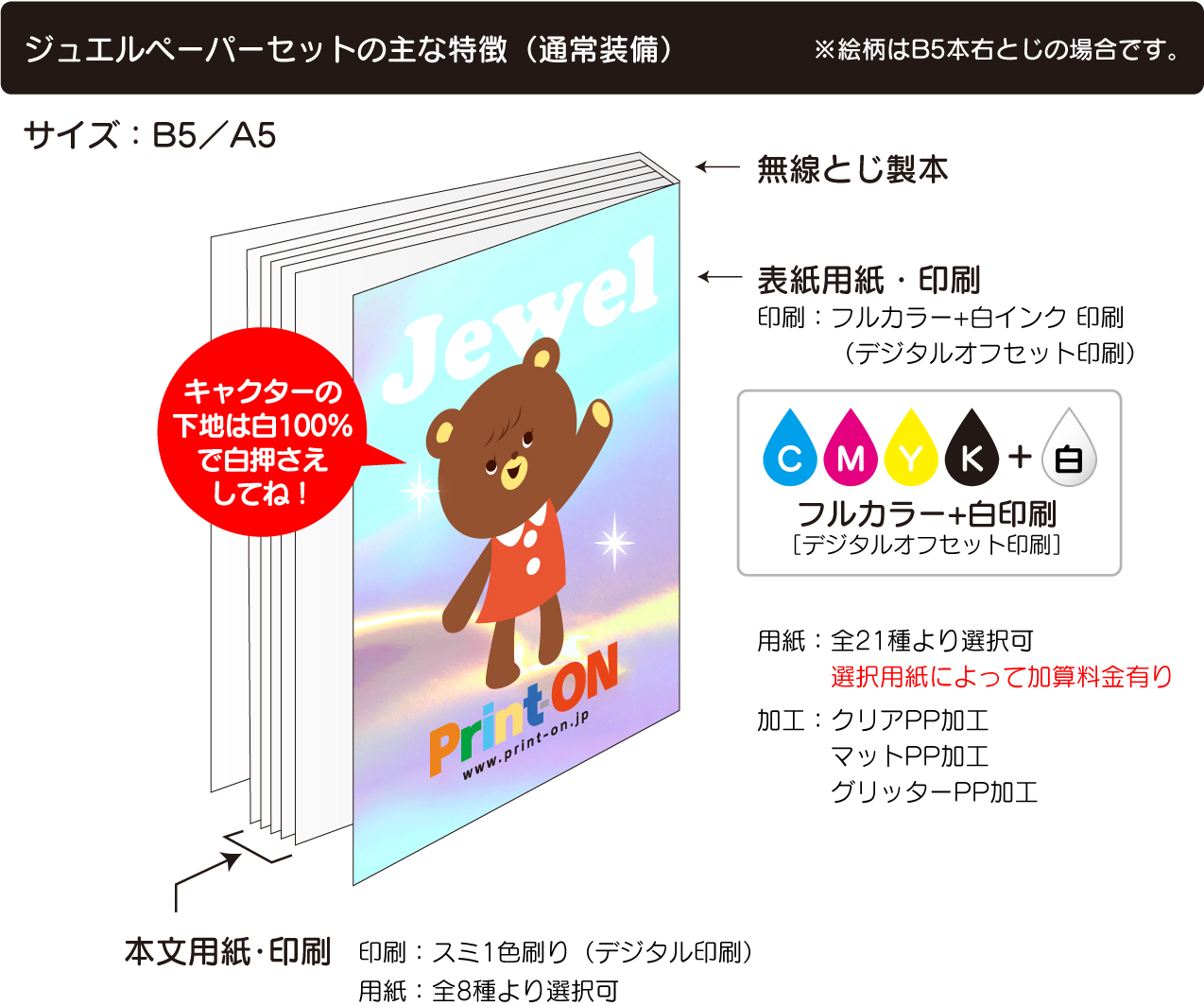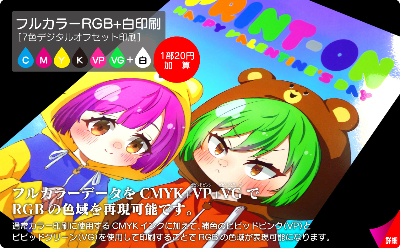 | 表紙印刷をフルカラーRGB+白印刷に変更できます。 マイページからご注文時に仕様選択画面で「印刷:フルカラーRGB+白印刷」を選択して下さい。 ※入稿データはRGBデータのままご入稿下さい。 |