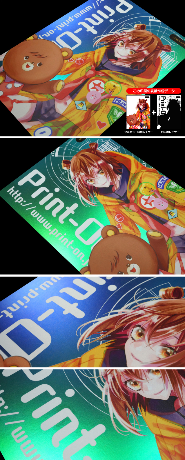 | ジュエルペーパー195kgセクシーパープル/フルカラーRGB+白印刷/クリアPP ベースは赤紫系のパープルですが、見る角度によりブルーやゴールドへと変色します。 |
