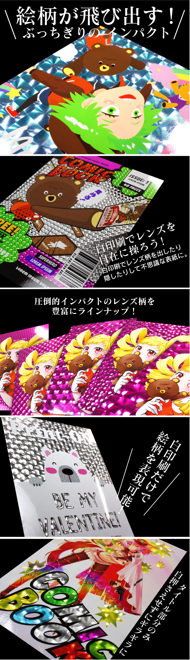 | 絵柄が飛び出して見える不思議な用紙「レンズペーパー」が表紙のセットです。 圧倒的インパクトのレンズペーパーにフルカラー+白印刷が標準装備。 飛び出して見せたい部分やレンズ柄を消したい部分には白印刷を施して下さい。 |