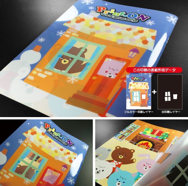 | 背景に白印刷をせずにマゼンタ50%のみで印刷、ピンクの透ける表紙にしています。 さらにタイトルを白印刷のみで表現して白い文字のタイトルに。 |