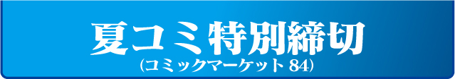 COMIC MARKET84で1万円以上ご注文のお客様は直接搬入料無料となります。 ご利用のお客様は直接搬入料金襴に「サービス」と明記してください。 ※早期入稿でスペースが不明な場合、後日スペースをご連絡ください。 ※1万円未満のお客様は別途搬入料1,500円が必要となります。 |
