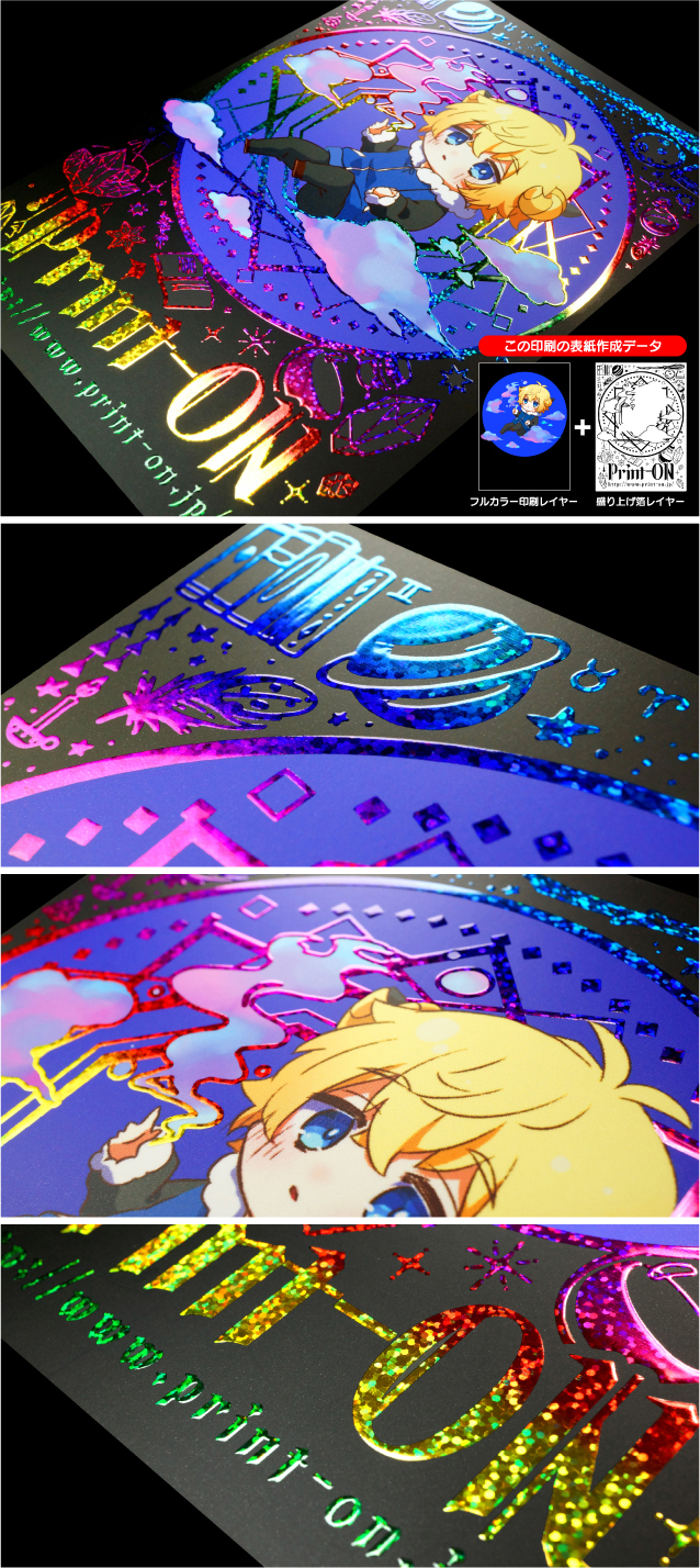 | コートカード紙180kg/フルカラーRGB印刷/マットPP/盛り上げ箔加工:虹 「虹」は斜め方向にグラデーションで色が変わる面白い箔です。 イラスト等の主線を盛り上げ箔にすると面白い効果が得られます。 |