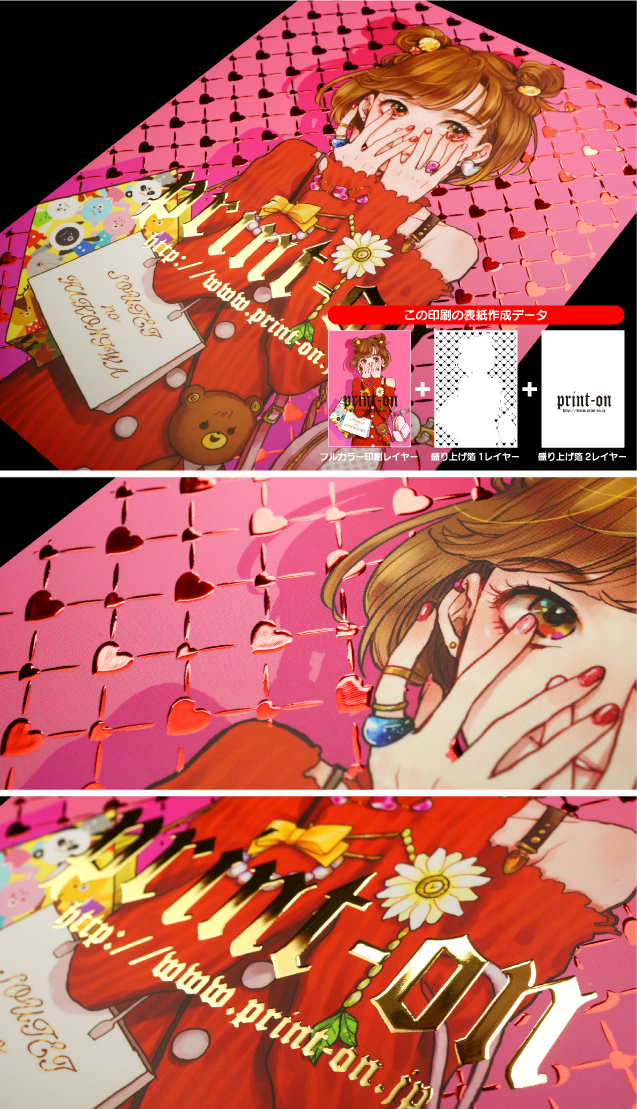 | コートカード紙180kg/フルカラーRGB印刷/マットPP/盛り上げ箔加工:ゴールド オーダーメイド注文「2回目盛り上げ箔加工」ピンク ハート部分とタイトル内側の模様等にピンクの盛り上げ箔、 タイトル外側やクラウンをゴールドの盛り上げ箔を行っています。 |