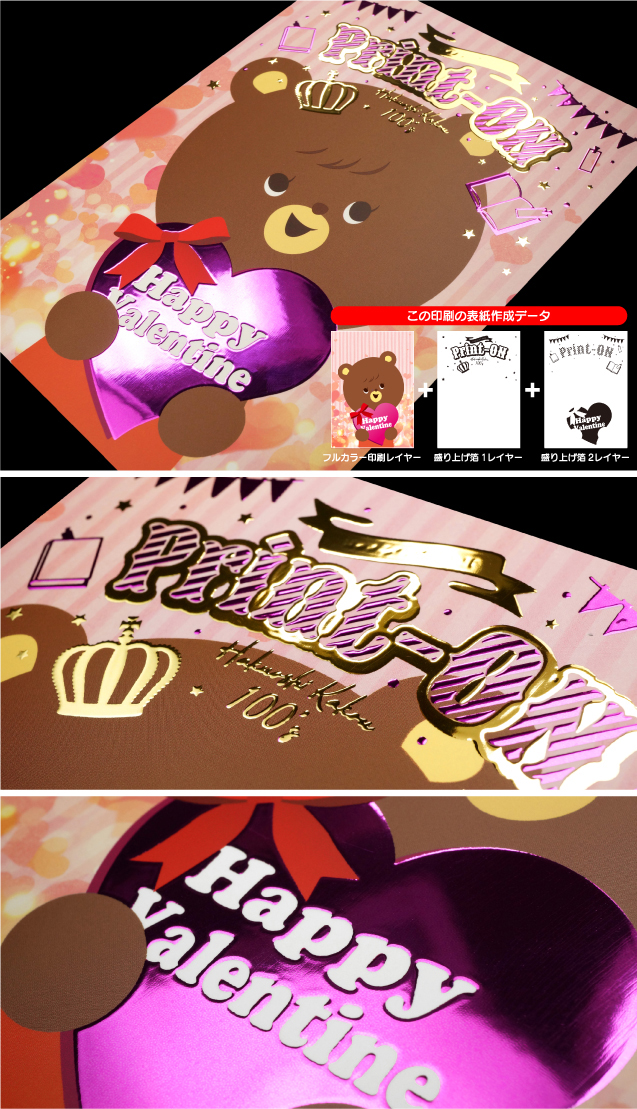 | コートカード紙180kg/フルカラーRGB印刷/マットPP/盛り上げ箔加工:レッド オーダーメイド注文「2回目盛り上げ箔加工」ゴールド タイトルにゴールドの盛り上げ箔、背景のハート模様にレッドの盛り上げ箔を行っています。 |