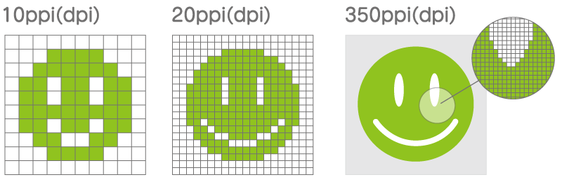 図は1辺が1インチであると仮定してご確認ください。1インチを縦横10マス(10ppi)・20マス(20ppi)・350マス(350ppi)として比較するとマス目が細かくなるに連れて精密な再現が出来ていることが見て取れます。