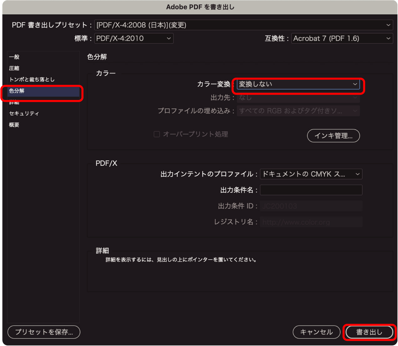 | 色分解項目で、カラー変換が「変換しない」になっているかを確認し、書き出しで完了。 |