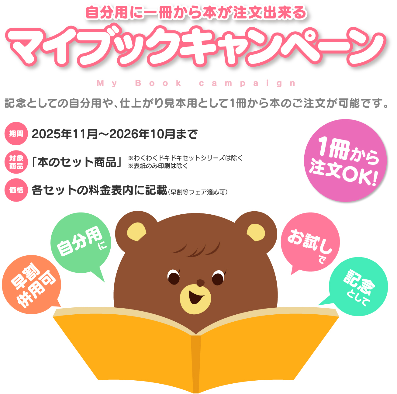 | 概 要 | ご要望が多かった1冊から本の注文が出来る「マイブックキャンペーン」を1年間の期間限定で復活させました。記念としての自分用や仕上がり見本として1冊からご注文が可能です。料金は各セットの料金表に追記してあります。早割等も併用できます。 |