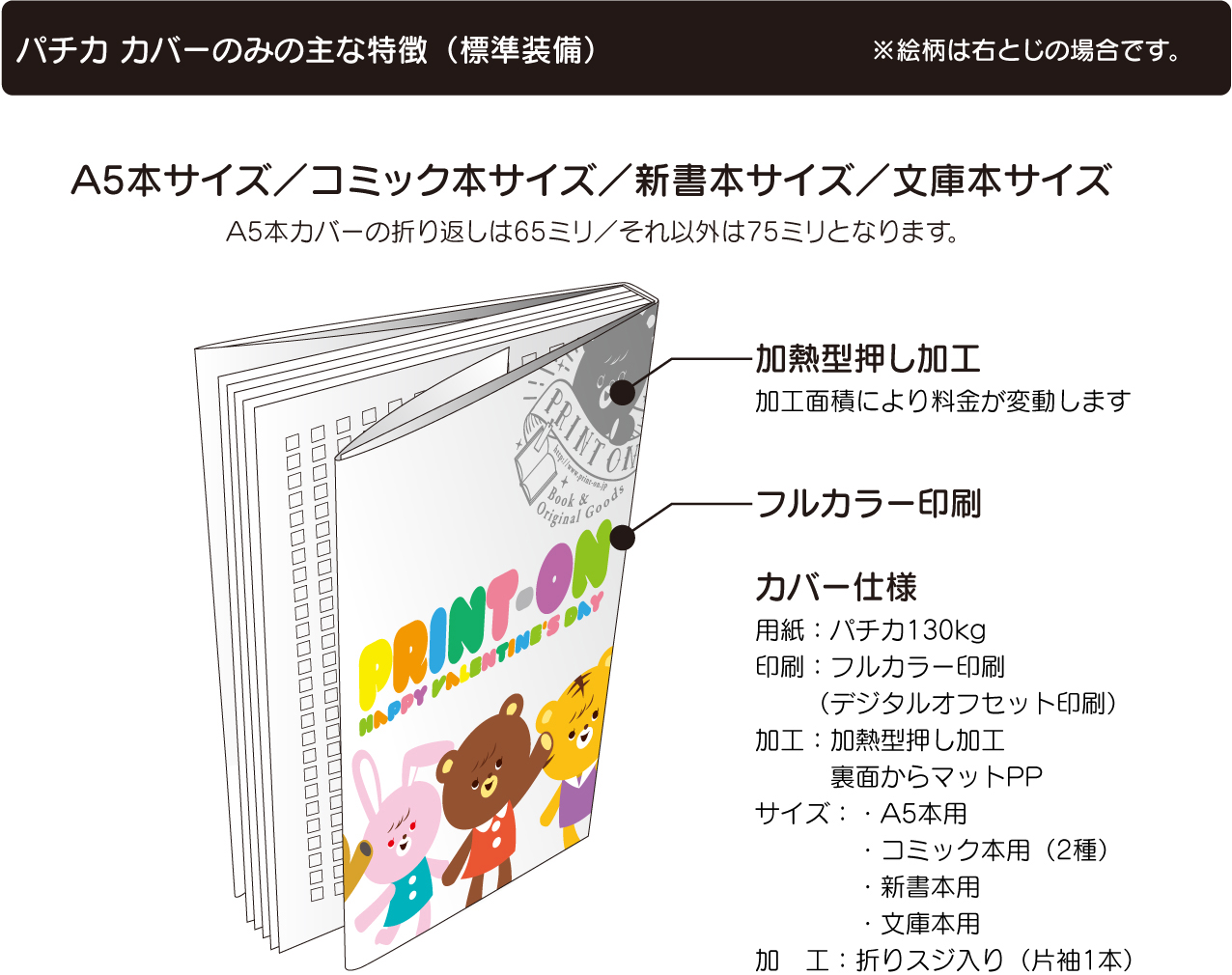 ※A5カバーは、背幅20mmまでの対応です。 ※濃い色(フルカラー印刷)の上から加熱型押し加工を施すと、インクの溶け汚れやムラが発生する場合があります。 ※パチカの性質上、折り部分を何度も曲げたりしているとボソボソとしてきます。裏面よりマットPPを施しますので破れることはございません。予めご了承の上ご発注下さい。 ※パチカに加熱型押しすると、用紙の「うねり」が発生する場合があります。特に広いベタ面積のある絵柄の場合プレス時間を長くする為に、その傾向が高まります。線画のようなデザインをお勧めいたします。 ※折り部分や断裁位置に濃い色の印刷があると、インクトナーの割れが発生する恐れがございます。 ※印刷機械の幅サイズの制約で印刷出来ませんので、折り返しを伸ばすことができません。 ※カバーのみ発注のお客様は自己責任において、サイズ等を良くご確認のうえ、ご注文ください。 ※カバーのみのご注文の場合はズレを考慮しまして表紙1側の折りのみ1か所入れた状態で作成いたします。 |
