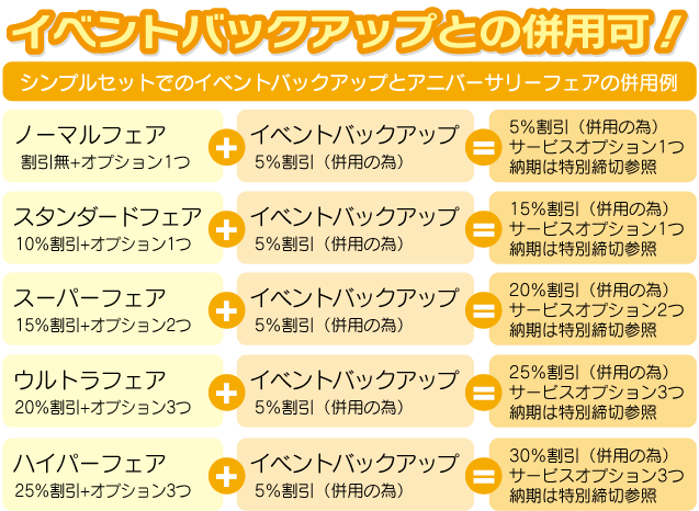 | 各セットの【専用オプション】や【セット内の特殊加工】は対象外となります。 | |||