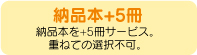 納品本+5冊 | ご注文頂いた冊数に更に5冊追加して納品します。 ★+5冊分の加工料金は発生しません。 ★サービスオプションのグッズもご選択の場合、グッズ部数も+5部となります。 |