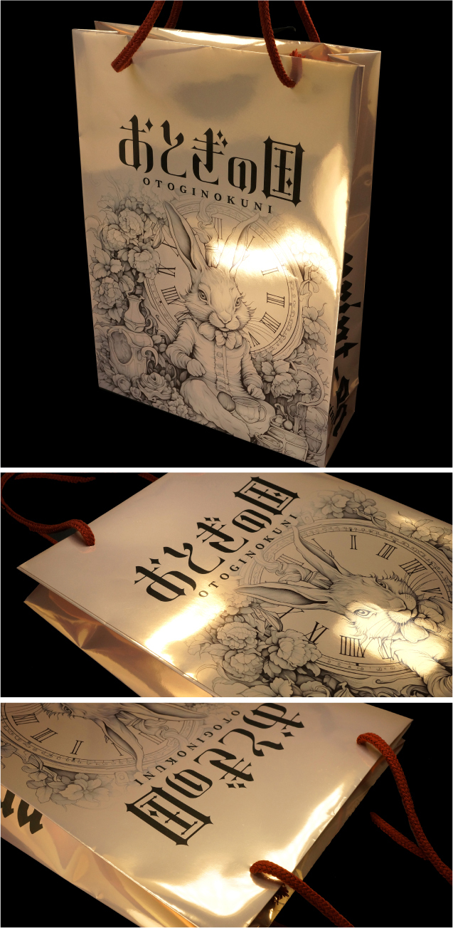 | ペーパーバッグ:Mタテタイプ/おとぎのくに110kgようせいのこな/CMYK+白印刷/クリアPP 持ち手:丸ひも ブラウン |