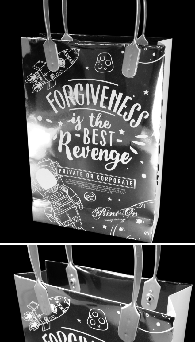 | ペーパーバッグ:Mタテタイプ/メタルペーパーシルバー/CMYK+白印刷/クリアPP 持ち手:ハッピータック ブラック |