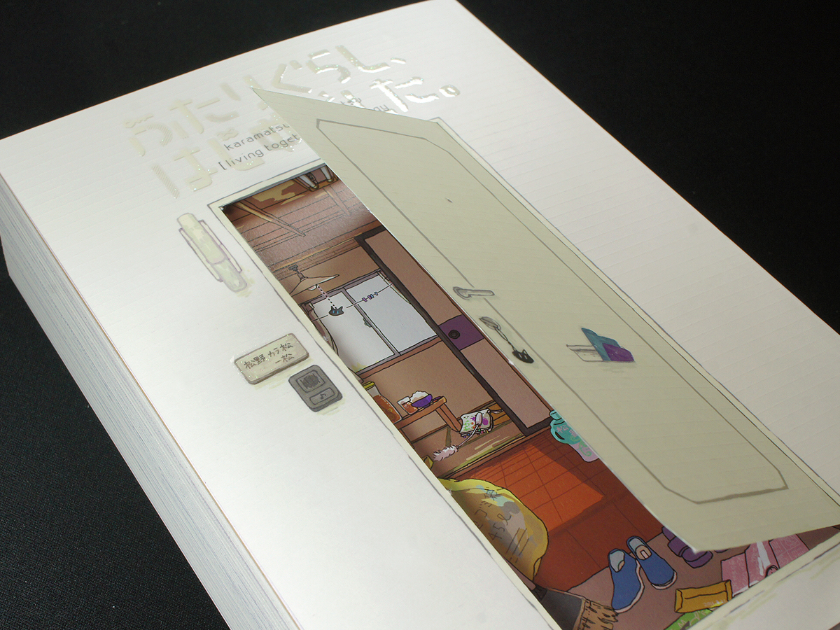 コミケ限定のペーパーバッグは中を覗くとかわいいインテリアが並びます。本の表紙もアートカットで窓と玄関のドアを再現。二人暮らしのアパートの小さな部屋をイメージさせます。表1のドアは「つなぎ」を残したままにしてあるので、初めて読む時にちぎって開きます。