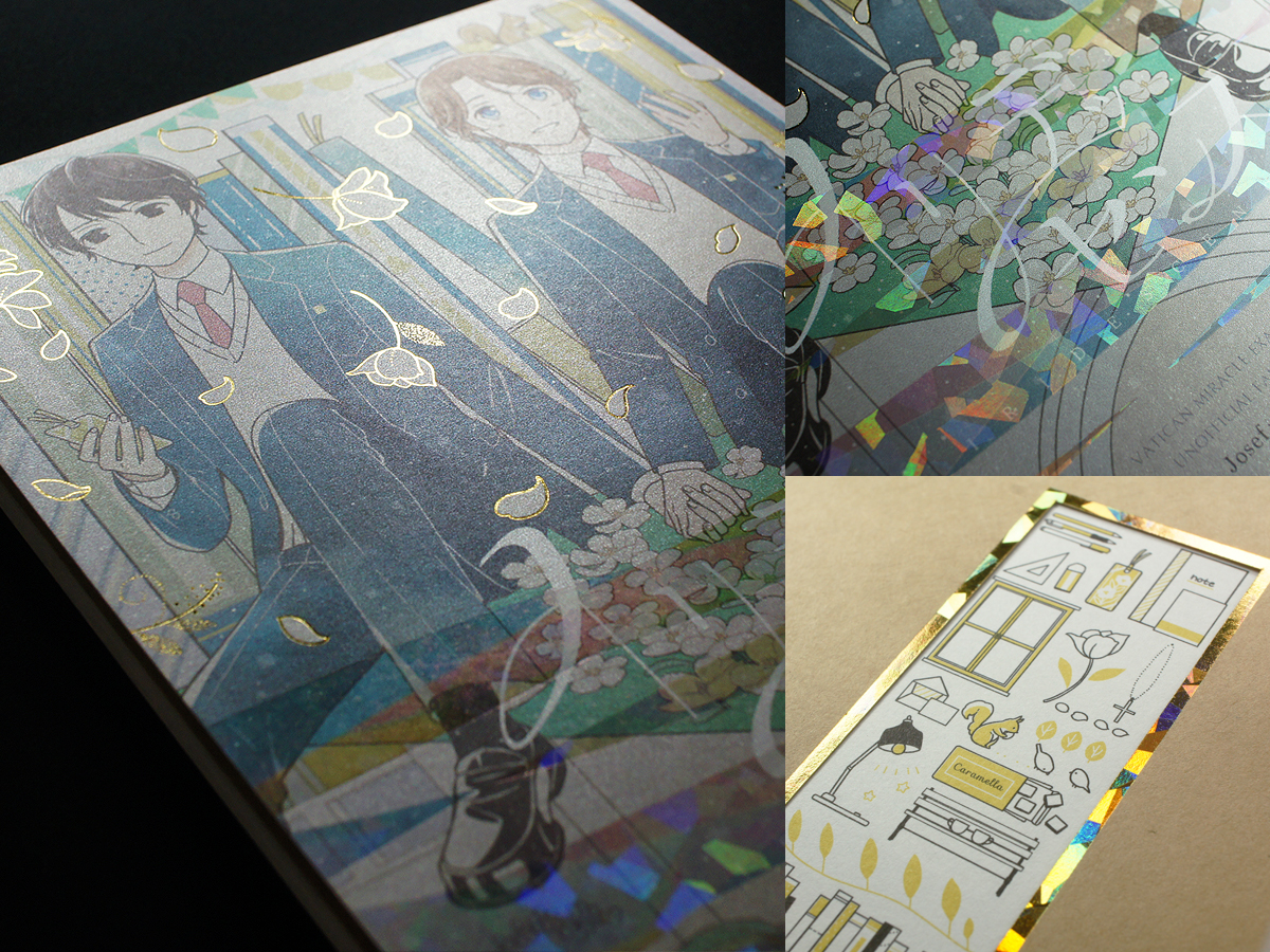 特殊加工:箔押し加工(金・リフレックス透明)・遊び紙カッティング加工・遊び紙箔押し加工(リフレックス透明)・