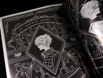 表紙のメタルペーパー165kgシルバーは人物と文字のみ白印刷が施されており、背景や小物はメタリックな質感が残ったままのデザインに。さらにエンボスPPフォグを貼ることで、霧がかった妖しげ且つクールな雰囲気を演出。