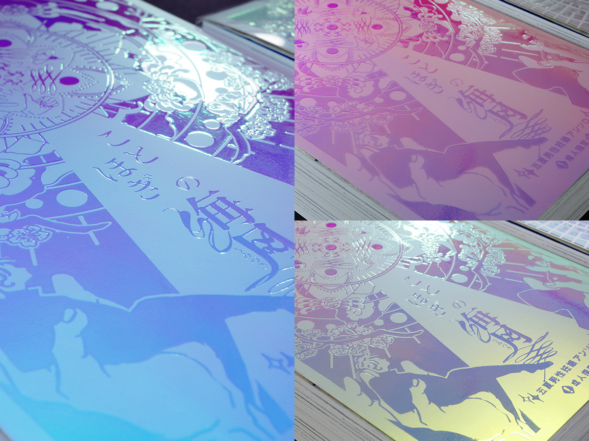 表紙には印刷が全くなく、エンボスニス加工のみで絵柄を表現してあります。マットPPを貼ると輝き方が変化し落ち着いた色味になり、エンボスニス加工で元に戻るジュエルペーパーの特性を活かし、作品のコンセプトである「海と月」の海をジュエルペーパーオーシャンブルー(エンボスニス部分)で、月の光をマットPPの落ち着いた輝きで表現されています。
